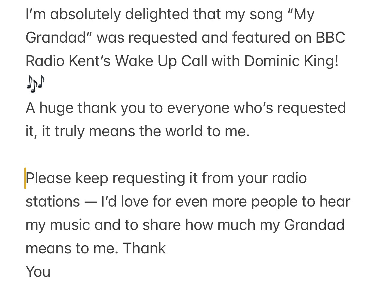 by Diane Thank you. BBC Radio Kent plays my song Published: 22 October 2025 10:19:32 Comments (0) Comments Member User name First Name Last Name Gender Marital status City Country About Me Activities Last Activity: Comments: Ratings: Leave your comments here: Don't you have anything to say ? ;-) Invalid. Can't contain links. Name (required): What's your name? Invalid. Can't contain links. Email me about follow up comments Combined code from above:
